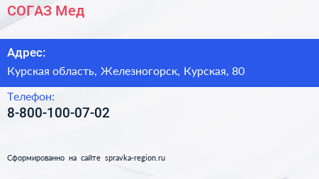 СОГАЗ-Мед по адресу Курская область, Железногорск, Курская, 80 в дальнейшем Организация, размещена в следующих категориях: