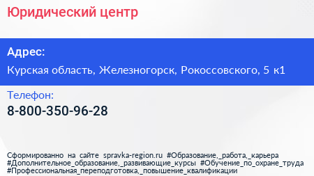 Юридический центр по адресу Курская область, Железногорск, Рокоссовского, 5 к1 в дальнейшем Организация, размещена в следующих категориях: