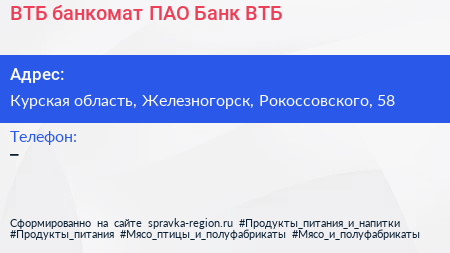 ВТБ, банкомат, ПАО Банк ВТБ по адресу Курская область, Железногорск, Рокоссовского, 58 в дальнейшем Организация, размещена в следующих категориях: