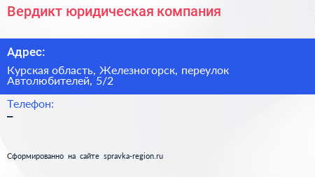 Вердикт, юридическая компания по адресу Курская область, Железногорск, переулок Автолюбителей, 5/2 в дальнейшем Организация, размещена в следующих категориях: