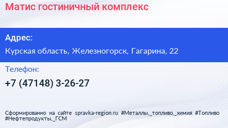 Матис, гостиничный комплекс по адресу Курская область, Железногорск, Гагарина, 22 в дальнейшем Организация, размещена в следующих категориях: