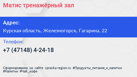 Матис, тренажёрный зал по адресу Курская область, Железногорск, Гагарина, 22 в дальнейшем Организация, размещена в следующих категориях: