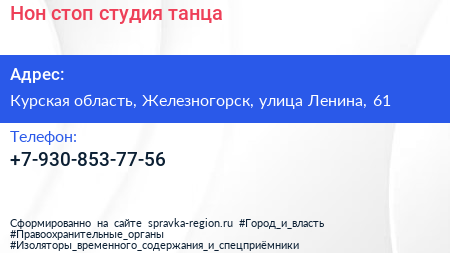 Нон-стоп, студия танца по адресу Курская область, Железногорск, улица Ленина, 61 в дальнейшем Организация, размещена в следующих категориях: