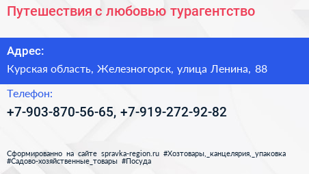 Путешествия с любовью, турагентство по адресу Курская область, Железногорск, улица Ленина, 88 в дальнейшем Организация, размещена в следующих категориях: