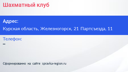 Шахматный клуб по адресу Курская область, Железногорск, 21 Партсъезда, 11 в дальнейшем Организация, размещена в следующих категориях: