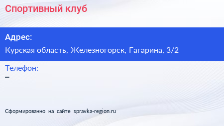 Спортивный клуб по адресу Курская область, Железногорск, Гагарина, 3/2 в дальнейшем Организация, размещена в следующих категориях: