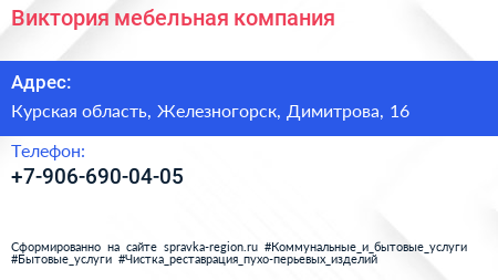Виктория, мебельная компания по адресу Курская область, Железногорск, Димитрова, 16 в дальнейшем Организация, размещена в следующих категориях: