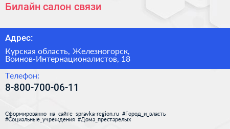 Билайн, салон связи по адресу Курская область, Железногорск, Воинов-Интернационалистов, 18 в дальнейшем Организация, размещена в следующих категориях: