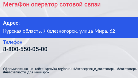 МегаФон, оператор сотовой связи по адресу Курская область, Железногорск, улица Мира, 62 в дальнейшем Организация, размещена в следующих категориях: