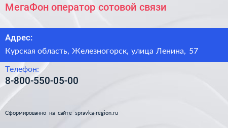МегаФон, оператор сотовой связи по адресу Курская область, Железногорск, улица Ленина, 57 в дальнейшем Организация, размещена в следующих категориях: