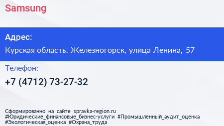 Samsung по адресу Курская область, Железногорск, улица Ленина, 57 в дальнейшем Организация, размещена в следующих категориях: