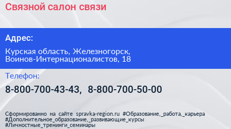 Связной, салон связи по адресу Курская область, Железногорск, Воинов-Интернационалистов, 18 в дальнейшем Организация, размещена в следующих категориях: