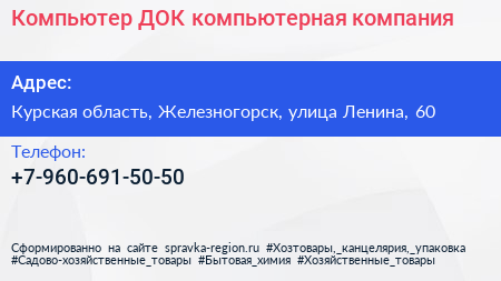 Компьютер ДОК, компьютерная компания по адресу Курская область, Железногорск, улица Ленина, 60 в дальнейшем Организация, размещена в следующих категориях: