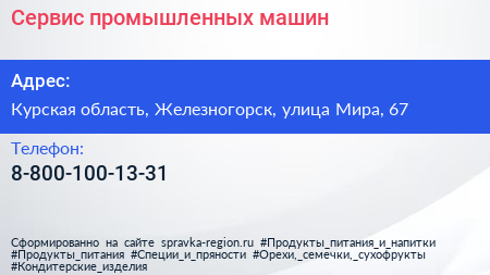 Сервис промышленных машин по адресу Курская область, Железногорск, улица Мира, 67 в дальнейшем Организация, размещена в следующих категориях: