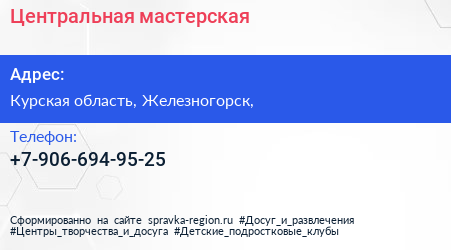Центральная мастерская по адресу Курская область, Железногорск, в дальнейшем Организация, размещена в следующих категориях: