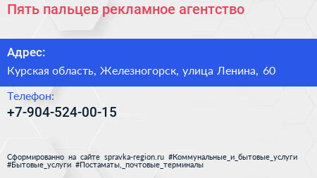 Пять пальцев, рекламное агентство по адресу Курская область, Железногорск, улица Ленина, 60 в дальнейшем Организация, размещена в следующих категориях: