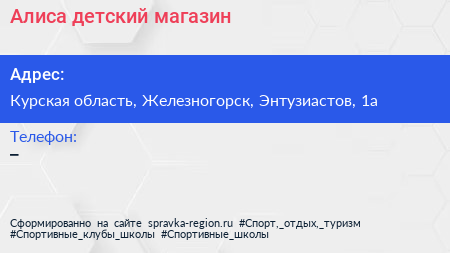 Алиса, детский магазин по адресу Курская область, Железногорск, Энтузиастов, 1а в дальнейшем Организация, размещена в следующих категориях: