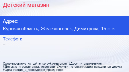 Детский магазин по адресу Курская область, Железногорск, Димитрова, 16 ст5 в дальнейшем Организация, размещена в следующих категориях: