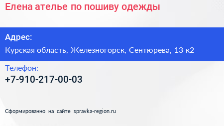 Елена, ателье по пошиву одежды по адресу Курская область, Железногорск, Сентюрева, 13 к2 в дальнейшем Организация, размещена в следующих категориях: