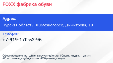 FOXX, фабрика обуви по адресу Курская область, Железногорск, Димитрова, 18 в дальнейшем Организация, размещена в следующих категориях: