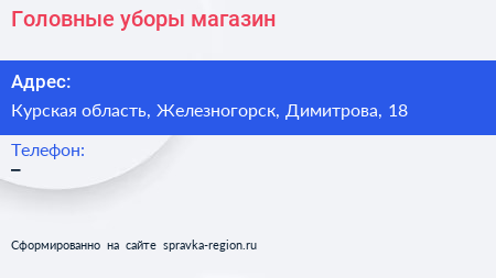 Головные уборы, магазин по адресу Курская область, Железногорск, Димитрова, 18 в дальнейшем Организация, размещена в следующих категориях: