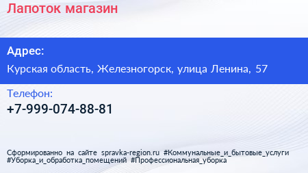 Лапоток, магазин по адресу Курская область, Железногорск, улица Ленина, 57 в дальнейшем Организация, размещена в следующих категориях: