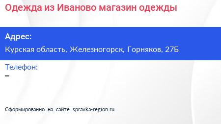Одежда из Иваново, магазин одежды по адресу Курская область, Железногорск, Горняков, 27Б в дальнейшем Организация, размещена в следующих категориях: