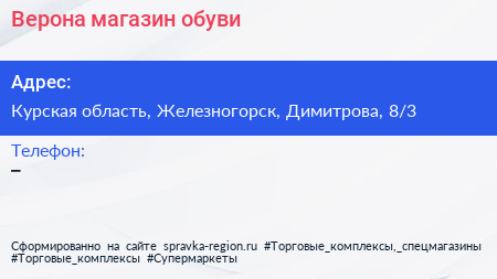 Верона, магазин обуви по адресу Курская область, Железногорск, Димитрова, 8/3 в дальнейшем Организация, размещена в следующих категориях: