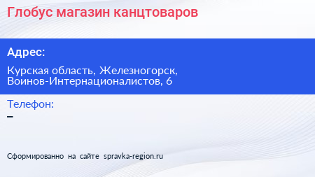 Глобус, магазин канцтоваров по адресу Курская область, Железногорск, Воинов-Интернационалистов, 6 в дальнейшем Организация, размещена в следующих категориях: