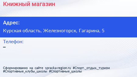 Книжный магазин по адресу Курская область, Железногорск, Гагарина, 5 в дальнейшем Организация, размещена в следующих категориях: