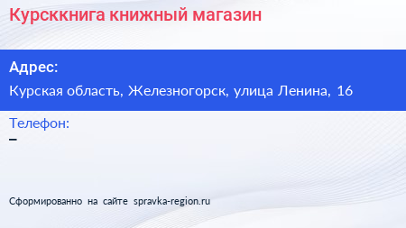 Курсккнига, книжный магазин по адресу Курская область, Железногорск, улица Ленина, 16 в дальнейшем Организация, размещена в следующих категориях: