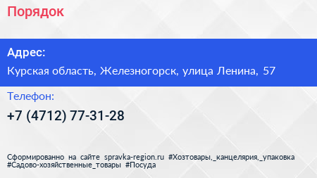Порядок по адресу Курская область, Железногорск, улица Ленина, 57 в дальнейшем Организация, размещена в следующих категориях: