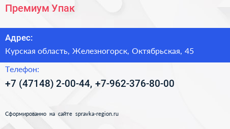 Премиум Упак по адресу Курская область, Железногорск, Октябрьская, 45 в дальнейшем Организация, размещена в следующих категориях: