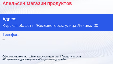 Апельсин, магазин продуктов по адресу Курская область, Железногорск, улица Ленина, 30 в дальнейшем Организация, размещена в следующих категориях: