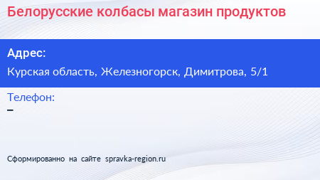 Белорусские колбасы, магазин продуктов по адресу Курская область, Железногорск, Димитрова, 5/1 в дальнейшем Организация, размещена в следующих категориях: