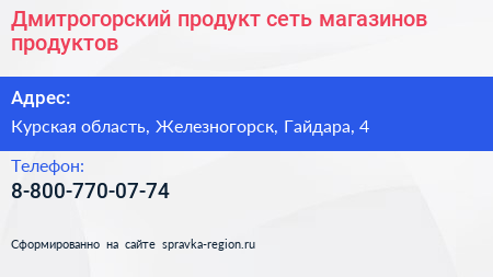 Дмитрогорский продукт, сеть магазинов продуктов по адресу Курская область, Железногорск, Гайдара, 4 в дальнейшем Организация, размещена в следующих категориях: