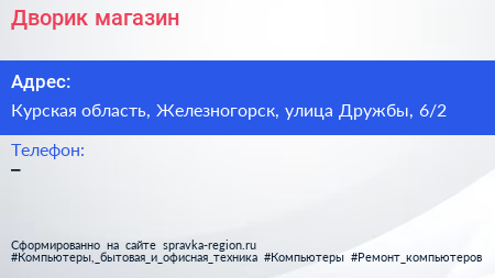 Дворик, магазин по адресу Курская область, Железногорск, улица Дружбы, 6/2 в дальнейшем Организация, размещена в следующих категориях: