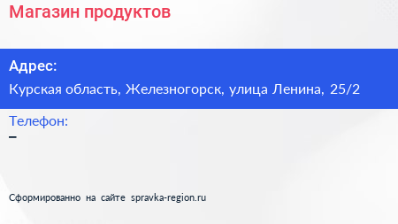 Магазин продуктов по адресу Курская область, Железногорск, улица Ленина, 25/2 в дальнейшем Организация, размещена в следующих категориях: