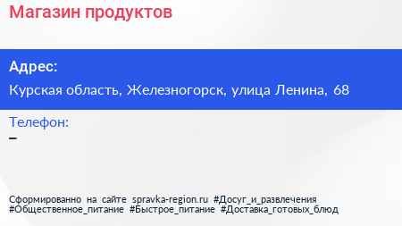 Магазин продуктов по адресу Курская область, Железногорск, улица Ленина, 68 в дальнейшем Организация, размещена в следующих категориях: