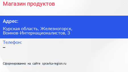 Магазин продуктов по адресу Курская область, Железногорск, Воинов-Интернационалистов, 3 в дальнейшем Организация, размещена в следующих категориях: