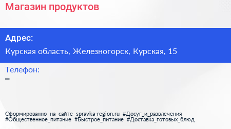 Магазин продуктов по адресу Курская область, Железногорск, Курская, 15 в дальнейшем Организация, размещена в следующих категориях: