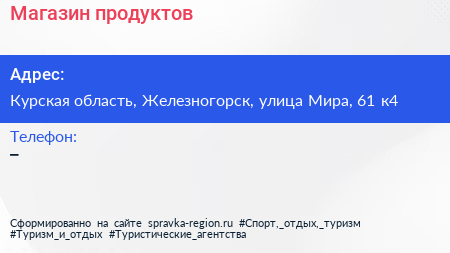 Магазин продуктов по адресу Курская область, Железногорск, улица Мира, 61 к4 в дальнейшем Организация, размещена в следующих категориях:
