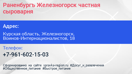 Раненбургъ Железногорск, частная сыроварня по адресу Курская область, Железногорск, Воинов-Интернационалистов, 18 в дальнейшем Организация, размещена в следующих категориях: