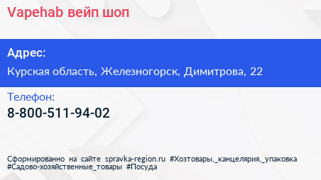 Vapehab, вейп шоп по адресу Курская область, Железногорск, Димитрова, 22 в дальнейшем Организация, размещена в следующих категориях: