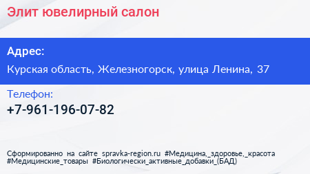 Элит, ювелирный салон по адресу Курская область, Железногорск, улица Ленина, 37 в дальнейшем Организация, размещена в следующих категориях: