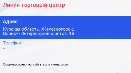 Линия, торговый центр по адресу Курская область, Железногорск, Воинов-Интернационалистов, 18 в дальнейшем Организация, размещена в следующих категориях: