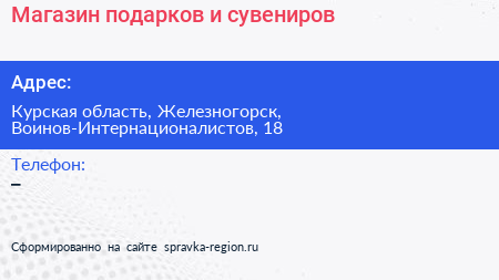 Магазин подарков и сувениров по адресу Курская область, Железногорск, Воинов-Интернационалистов, 18 в дальнейшем Организация, размещена в следующих категориях: