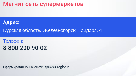 Магнит, сеть супермаркетов по адресу Курская область, Железногорск, Гайдара, 4 в дальнейшем Организация, размещена в следующих категориях: