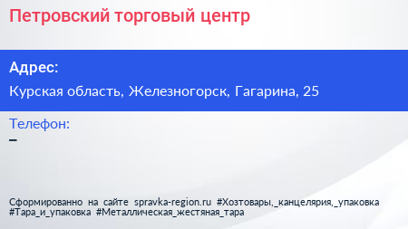 Петровский, торговый центр по адресу Курская область, Железногорск, Гагарина, 25 в дальнейшем Организация, размещена в следующих категориях: