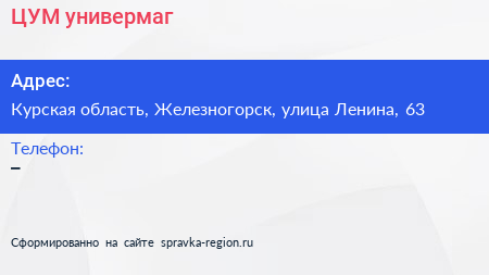 ЦУМ, универмаг по адресу Курская область, Железногорск, улица Ленина, 63 в дальнейшем Организация, размещена в следующих категориях: